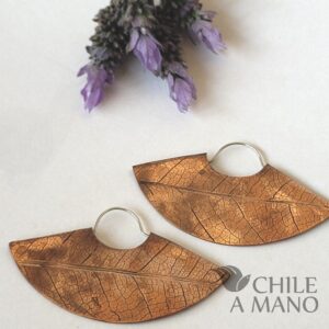 Estos aros en forma de abanico destacan por su textura realista inspirada en las hojas del bosque esclerófilo. Una hermosa combinación entre el cálido brillo del cobre y un diseño que imita con precisión la superficie natural de una hoja, como si hubiese sido tomada directamente de un árbol de cobre en otoño.