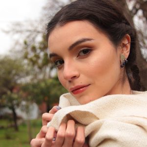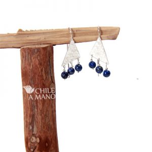 El lapislázuli, sin duda una de las gemas más bonitas que existen, y totalmente chilena. Aquí, sin más adorno que un sencillo soporte de plata, con ganchos colgantes, en un resultado discreto y elegante