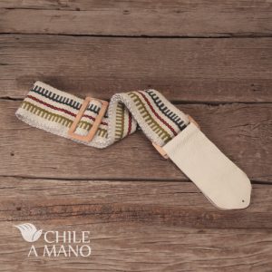 La textilería tiene múltiples expresiones y usos que van más allá de cobijar y dar abrigo. Este es el caso de esta pieza tejida cuidadosamente a telar para acompañar a músicos y músicas en sus sesiones tocando el bajo o la guitarra, con un bello diseño, con hebillas en madera de raulí talladas a mano y puntas de cuero curtido.