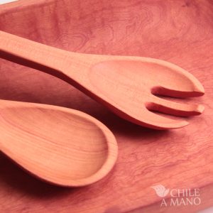Gran par de servicios de madera de Raulí que son el complemento perfecto para esa fuente de madera regalona del sur lluvioso, o incluso para acompañar una fuente de cerámica gres o greda tradicional Pomairina.