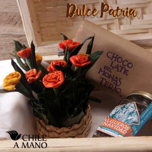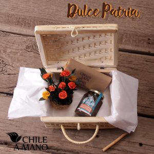 Un regalo para deleitar y encantar: Chocolate Bitter de Productos del Monasterio, reconocidos por su suavidad y buen sabor; mermelada de frutas y cochayuyo, para paladares exigentes que no temen probar sabores distintos, y como complemento un encantador arreglo de flores en hoja de choclo, delicadamente trenzadas, todo en nuestra preciosa maleta de mimbre, bien terminada y útil, pues permite guardar toda clase de objetos en su interior.