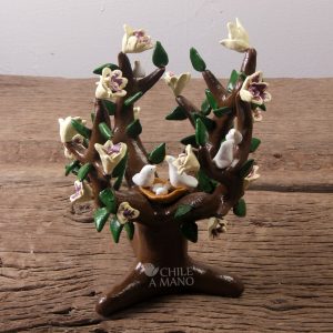 La antigua técnica de la loza policromada elabora delicadas piezas de greda pintadas a mano con motivos y escenas populares. El árbol es una de aquellas que tiene una historia reciente, pero se ha vuelto muy popular por su belleza y colorido. Este representa un magnolio en flor, con nidos de palomas en sus ramas.