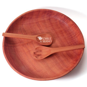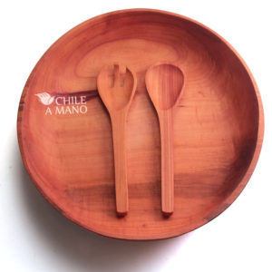 Grande y maravillosa fuente de grandes dimensiones, de preciosa madera veteada de rauli, tallada y lijada a mano, una sola pieza. Elegante y sencilla a la vez. Incluye set de cuchara y tenedor para servir. Las ensaladas, frutas, panes de distintos tipos, picoteo, o lo que queramos, luce precioso en contraste con su suave y noble madera.