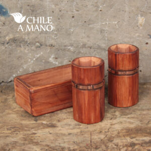 Los vasitos de madera de alerce para bajativo, se elaboran con tejuelas recicladas que ya no sirven para su fin original, que es el revestimiento de casas de madera. Esto además de ser una práctica sustentable, permite la creación de productos con materias primas de inigualable nobleza, como la madera de alerce, con un hermoso color, y que resiste perfectamente la humedad. Diseño con aplicaciones de cobre.