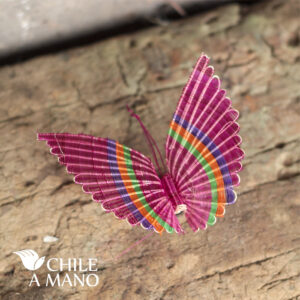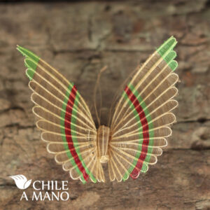 Mariposa de crin tejido en colores vivos y colores naturales. Una pieza que es todo un icono de la artesanía en crin de Rari y de Chile.