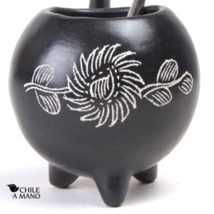Mate de greda de Quinchamalí con el tradicional ahumado y pulido, que le da un aspecto negro brillante, y hermosos esgrafiados – dibujos bajo relieve- de flores en color blanco. Esta es una artesanía típica de la localidad de Quinchamalí en la región de Ñuble ¡Artesanía utilitaria que le da belleza a tu día a día!