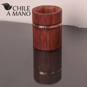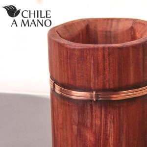 El Mate de madera de alerce con cobre, se elabora con tejuelas reciclada que ya no sirven para su fin original, que el revestimiento de casas de madera. Esto además de ser una práctica sustentable, permite la creación de productos con materias primas de inigualable nobleza, como la madera de alerce, que resiste perfectamente la humedad. Diseño con grecas pirograbadas.