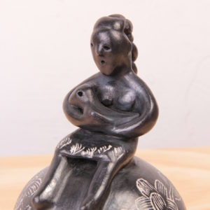 Figura decorativa de una mujer que sostiene en sus brazos un ave, con flores y adornos en la tradicional base esférica de la cerámica de Quinchamalí.