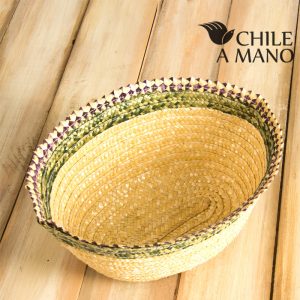 La cuelcha de trigo es un arte que está enraizado en lo más profundo de la tradición del campo chileno, a partir de las fibras de trigo se confeccionan diversas piezas como estas bellas paneras de un color dorado natural del trigo que resalta con el ribete de color.