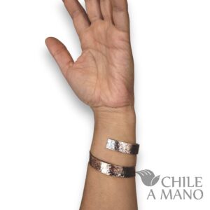 Pulsera unisex confeccionada en lámina de cobre forjada a fuego, modelada en una forma de espiral que simboliza el retorno al origen y el movimiento constante de la vida. Su diseño versátil permite usarla como pulsera o brazalete, adaptándose cómodamente a la muñeca o brazo de hombre o mujer, gracias a su ajuste flexible.