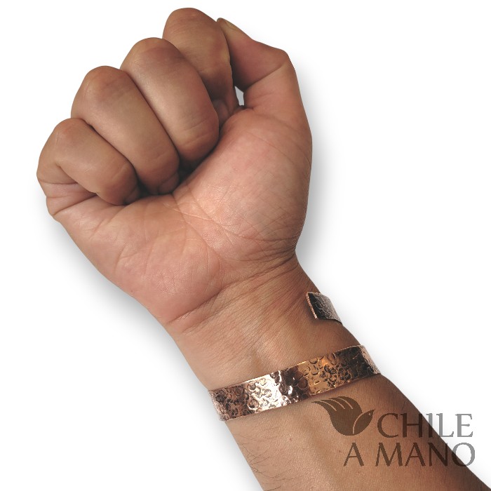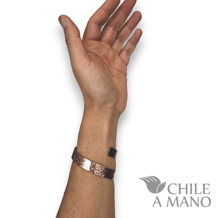 La textura rústica y llena de carácter contrasta con el brillo cálido del cobre, un tono que recuerda los colores del atardecer. Una pieza auténtica, fuerte y con identidad, perfecta para quienes valoran lo hecho a mano y la conexión con materiales nobles.