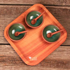 En el Set de Aperitivo en plato cuadrado de madera de Raulí, materias primas y formas se reúnen en un resultado armónico y colorido, que puede ser usado para servir un aperitivo o un trio de salsas. La base es perfecta como tabla de montaje para quesos o lo que tu quieras. Un regalo lindísimo que lleva a la mesa la belleza y el encanto de dos expresiones de la artesanía chilena.