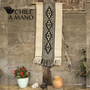 En este telar mural mapuche, la iconografía destaca y es una de las expresiones más representativas de la cultura Mapuche, inconfundible por el contraste de colores y la perfección en el hilado de la lana finamente torcida a mano.
