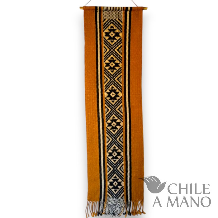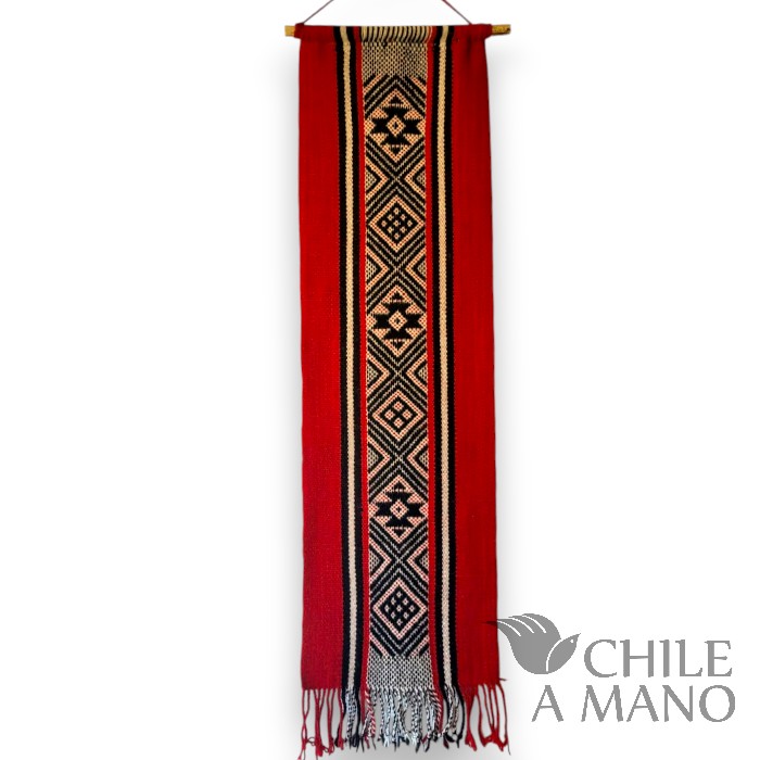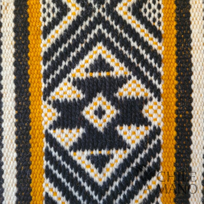 Con su presencia cálida y llena de simbolismo, esta obra destaca por sus iconografías geométricas y por la perfección en el hilado: lana finamente torcida a mano, siguiendo una de las tradiciones más representativas de la cultura Mapuche.