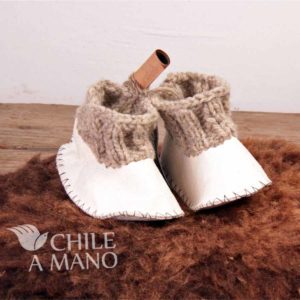Desde la Isla Grande de Chiloé, llegan estos zapatitos de cuero curtido natural y tejido en lana para guaguas de 0 a 6 meses. Los materiales nobles como el cuero y la lana, ayudan a equilibrar la temperatura naturalemente en los pequeños, de ahí la importancia de usarlos, en vez de prendas hechas en materiales sintéticos. Artesanía chilena, útil y bella.